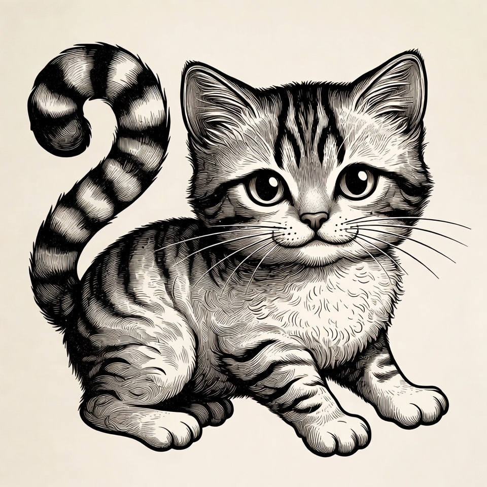 A detailed black and white illustration of a cute tabby kitten sitting with its striped tail curled around its body. The kitten has large expressive eyes, whiskers, and fluffy fur texture rendered in ink style. It is positioned on a plain isolated background.