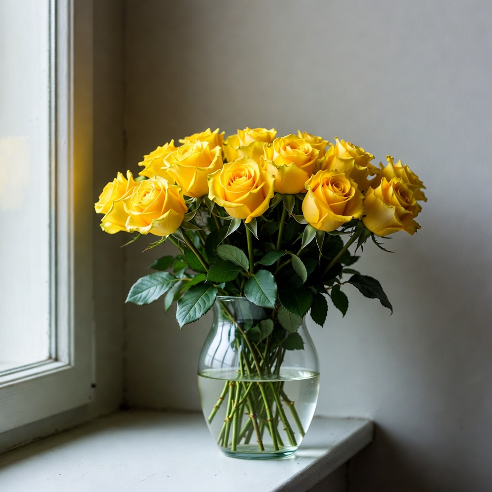 A vibrant bouquet of yellow roses sits in a clear glass vase on a windowsill. The roses feature lush green leaves and stems submerged in water. Soft natural light filters through the window behind the arrangement.