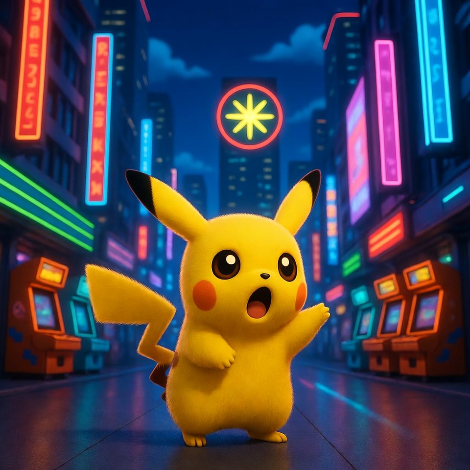 Pikachu stands excitedly on a vibrant neon-lit city street at night, waving one paw with its mouth open in surprise. Colorful signs, skyscrapers, and arcade machines glow in pink, blue, and purple hues around it. The scene features a starry emblem overhead and a starry night sky.