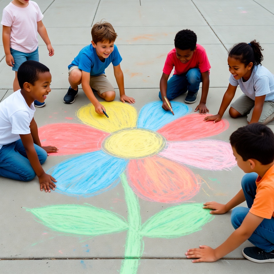 A group of diverse young children sits on a concrete playground, collaboratively drawing a large colorful flower using chalk. The flower features vibrant petals in red, yellow, blue, and green with a yellow center and green stem. The children, wearing casual t-shirts and shorts, hold chalk and smile while adding details to the artwork.
