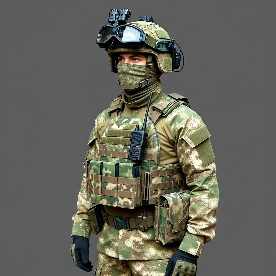A soldier stands in full tactical gear on a gray background. He wears a helmet with night vision goggles, a camouflage balaclava covering his face, and multicam uniform with plate carrier, pouches, and radio. His gloves and vest feature green and brown digital camouflage patterns.