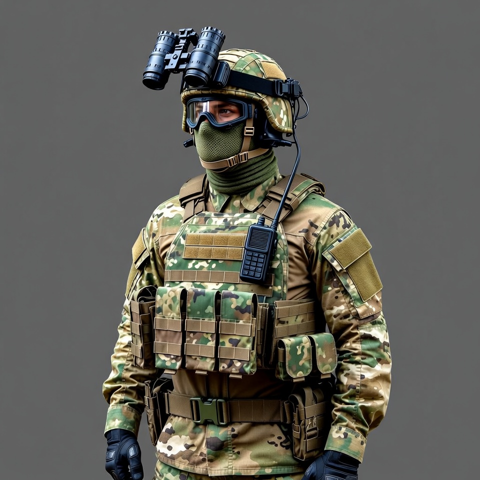 A soldier stands in full camouflage uniform on a gray background. He wears a tactical helmet with mounted night vision goggles, a green balaclava mask, and a plate carrier vest with pouches and a radio. His gloves and gear suggest special forces readiness.