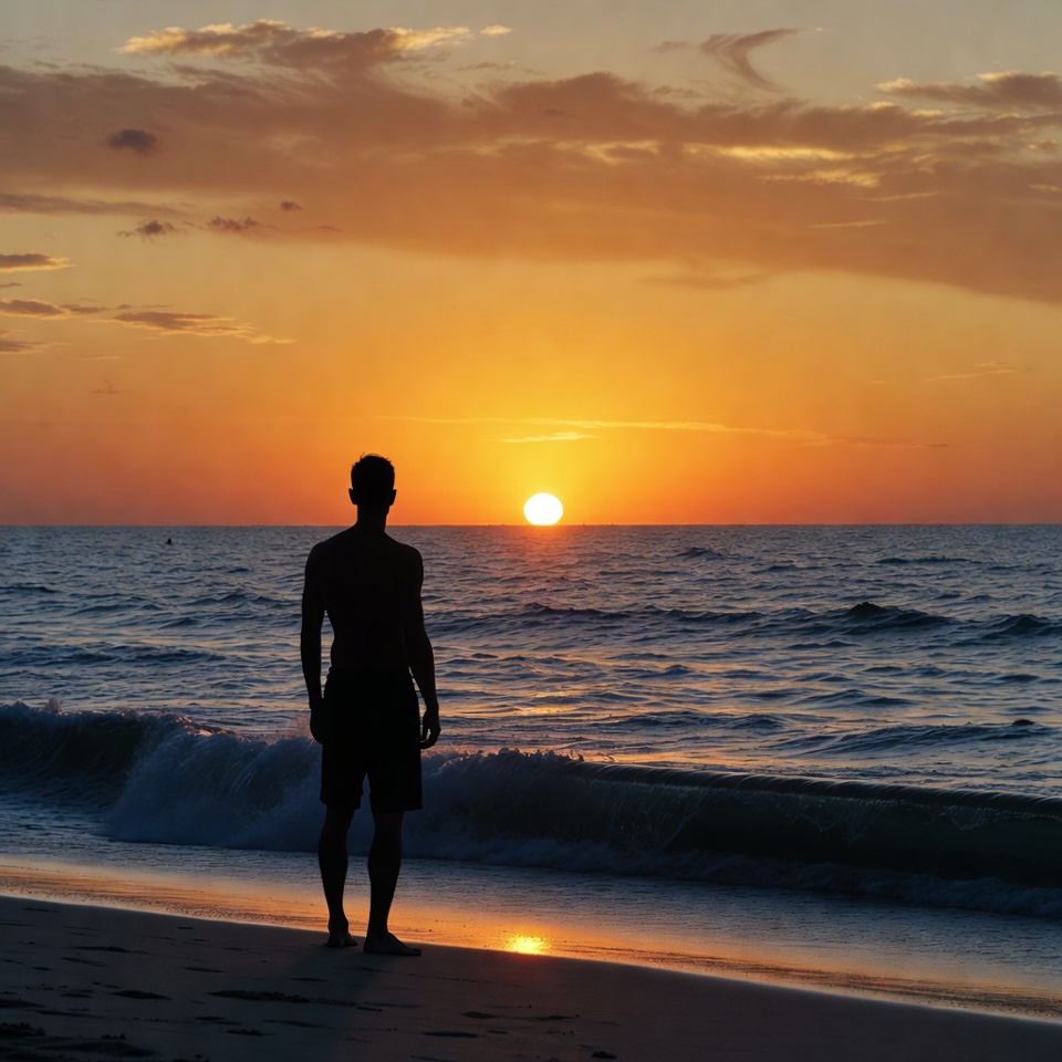 A shirtless man stands in silhouette on the beach, facing a vibrant orange sunset over the ocean. He wears shorts and gazes at the sun dipping toward the horizon with gentle waves lapping the shore. The sky is filled with scattered clouds in warm hues.