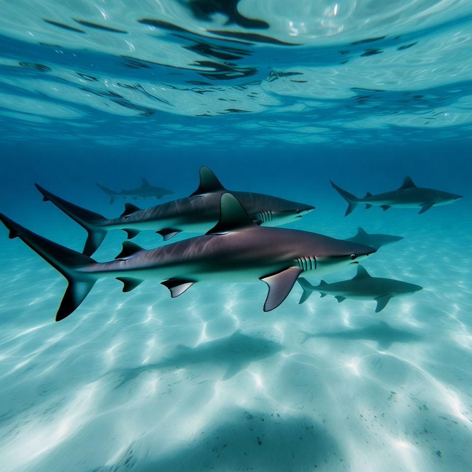 A group of blacktip sharks glides gracefully through clear turquoise ocean water. Their sleek bodies and distinctive black-tipped fins are visible against the sandy seabed. Sunlight filters from above, creating rippling light patterns on the sharks and water.