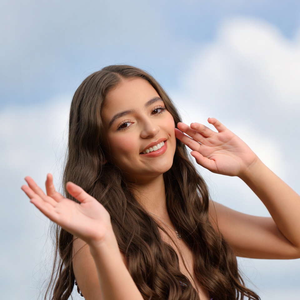 blue sky, brown hair, clouds, excited pose, female, hand gesture, happy expression, long hair, outdoor portrait, raised hands, smiling face, smiling girl, wavy hair, young woman, Latina girl