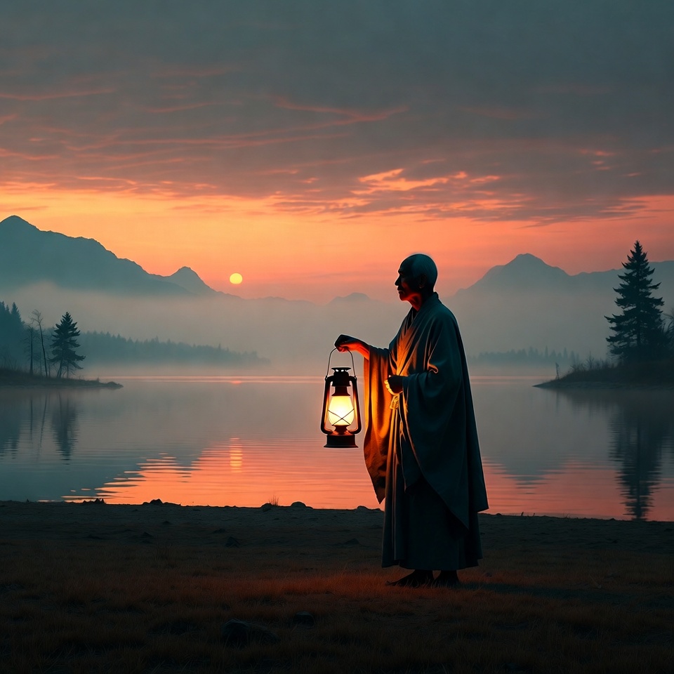 A silhouetted monk in flowing robes stands barefoot on the shore of a misty lake at sunset, holding a glowing lantern in his right hand. Majestic mountains rise in the background under an orange sky with the sun low on the horizon, and pine trees dot the foggy landscape. The lantern's warm light reflects on the calm water.
