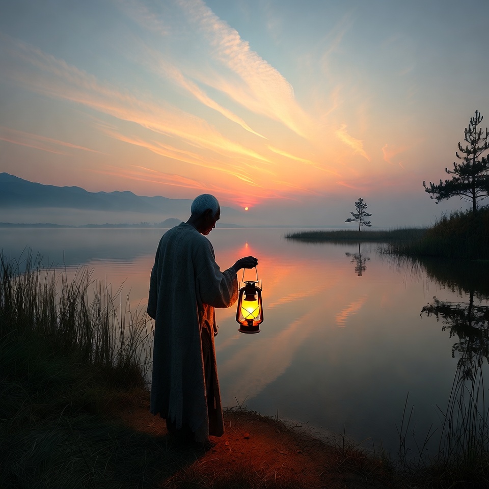 Asian, dawn, dusk, elderly man, fog, glowing light, grass, holding lantern, lake, lantern, mist, mountains, nature, orange sky, outdoors, pine trees, pink sky, reflection, robe, serene landscape, silhouette, sunset, water, white robe, man