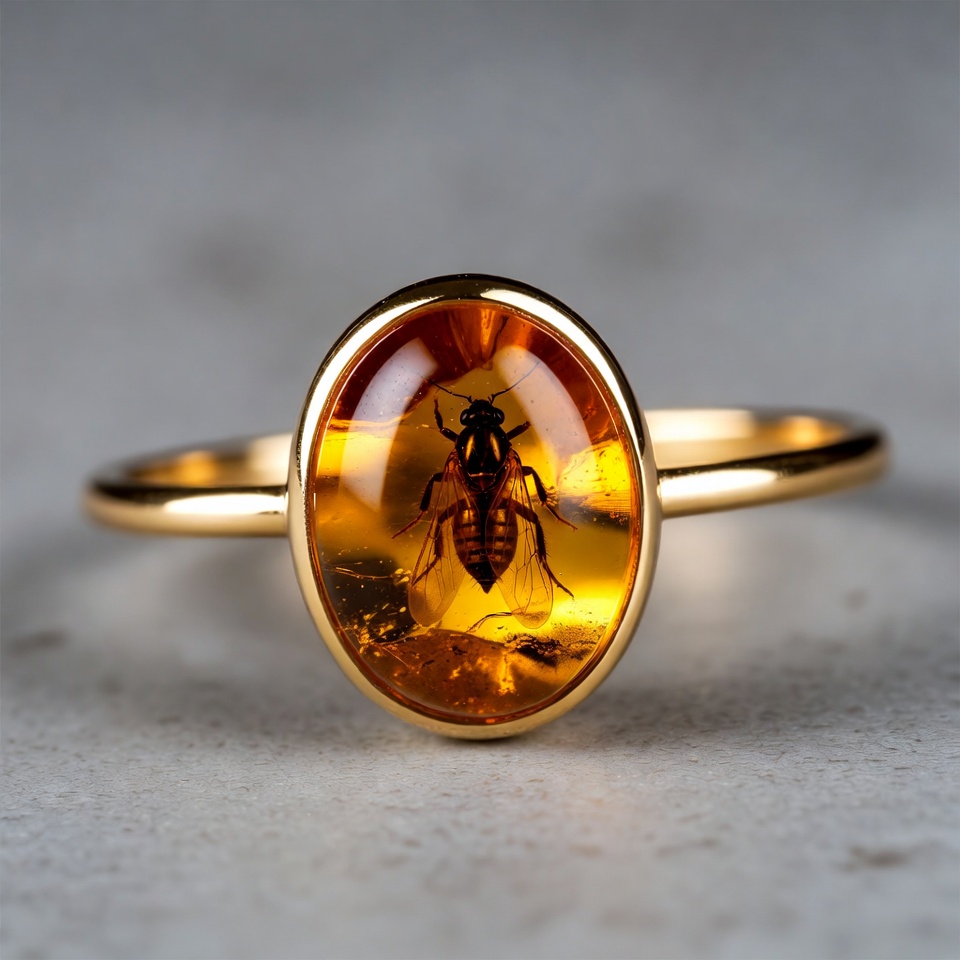 amber gemstone, amber jewelry, fossilized insect, gold band, gold ring, insect fossil, insect inclusion, jewelry, natural amber, oval amber, prehistoric insect, ring closeup, trapped wasp, wasp in amber, amber ring