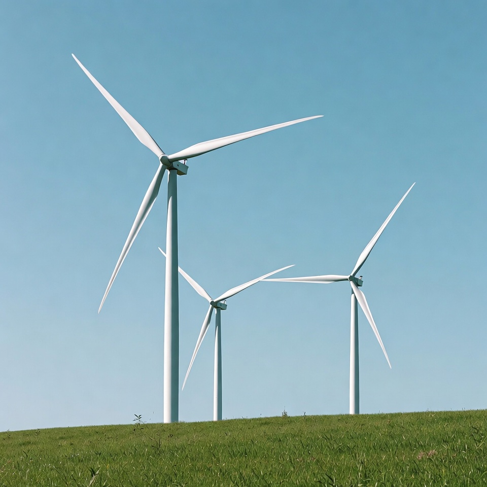 Three white wind turbines with large blades stand on a grassy hill under a clear blue sky. The turbines are positioned close together against the horizon. The scene features a vibrant green field at the base.