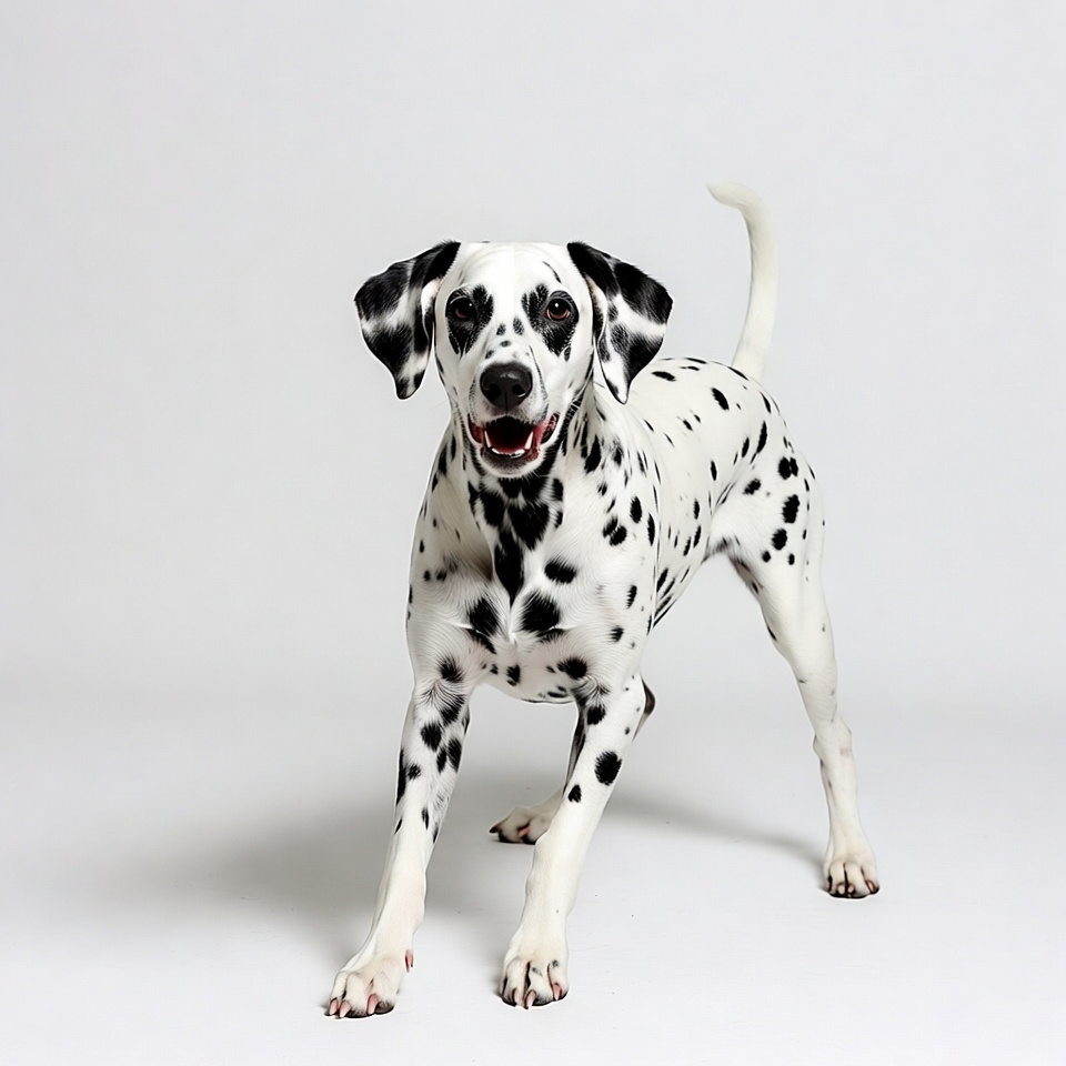A Dalmatian dog stands alert with its mouth open in a happy expression. It has distinctive black spots on white fur, floppy ears, and a curly tail. The dog is positioned playfully on a plain white background.