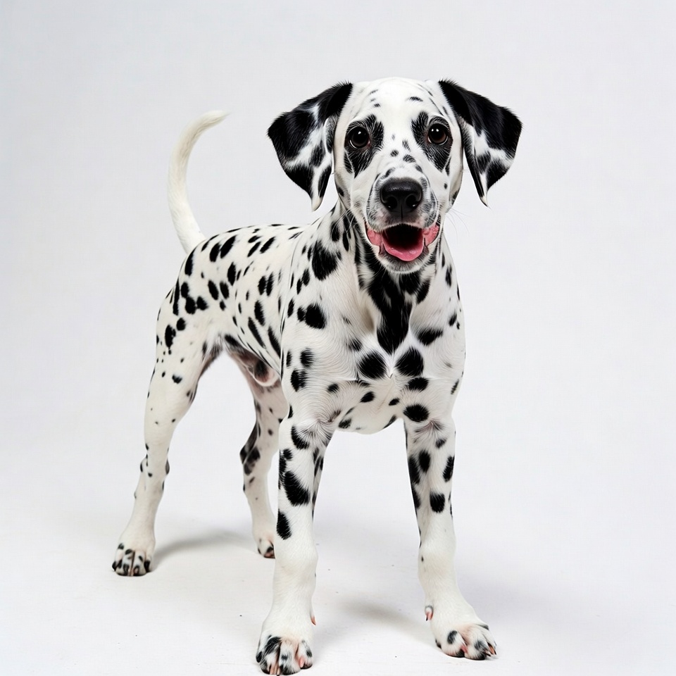 A young Dalmatian puppy with black spots stands alert on a plain white background. It has perky ears, a curly tail, and a happy expression with its tongue out. The puppy's paws are visible, showing its playful stance.
