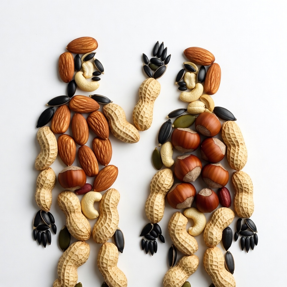 Two humanoid figures crafted from various nuts and seeds stand facing each other on a white background. The left figure is primarily composed of almonds, peanuts, cashews, black beans, and seeds, with a muscular build. The right figure features hazelnuts, peanuts, seeds, and almonds, raising one arm in a greeting gesture.