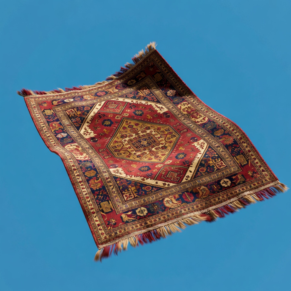 A traditional red Oriental rug with intricate geometric patterns in gold, blue, and navy floats against a solid blue sky. The rug features a central medallion design with ornate borders and fringed edges. It appears to be suspended in mid-air, evoking a magical flying carpet.