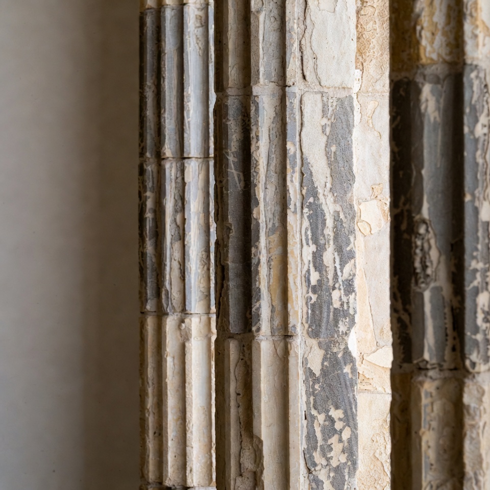 A close-up view of multiple tall stone columns with fluted designs and weathered surfaces. The columns feature gray and white marble with peeling and cracked textures. They stand against a light background, emphasizing architectural details.
