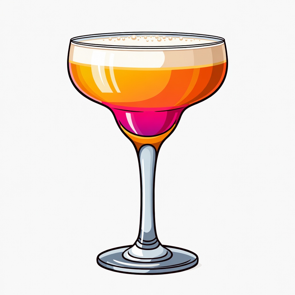 A vibrant illustration of a margarita cocktail in a tall stemmed glass features a pink layer at the bottom, transitioning to orange, topped with white foam and sugar rim. The glass has a clear stem and base on a transparent background. It is depicted in a colorful cartoon style.