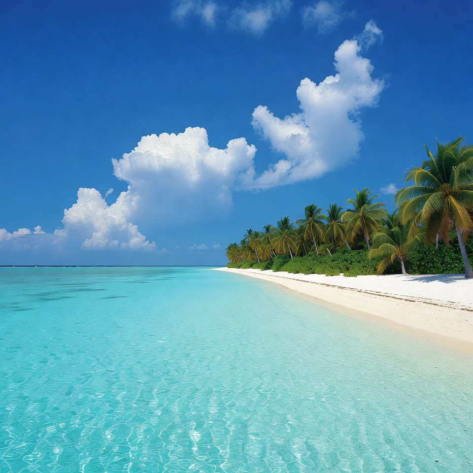 A pristine white sand beach meets crystal clear turquoise ocean waters under a bright blue sky. Tall palm trees line the shoreline with lush green foliage. Fluffy white clouds float above the serene tropical paradise.