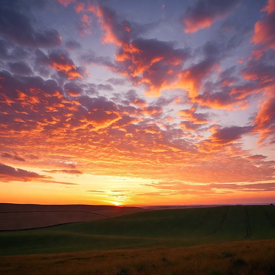 Vibrant Sunset Over Rolling Green Hills