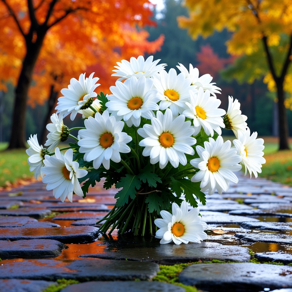 A bouquet of white daisies with yellow centers is tied with green stems and placed on a wet cobblestone path. Vibrant autumn trees with orange and yellow leaves stand in the blurred background. The scene features a park setting after rain with reflective puddles.