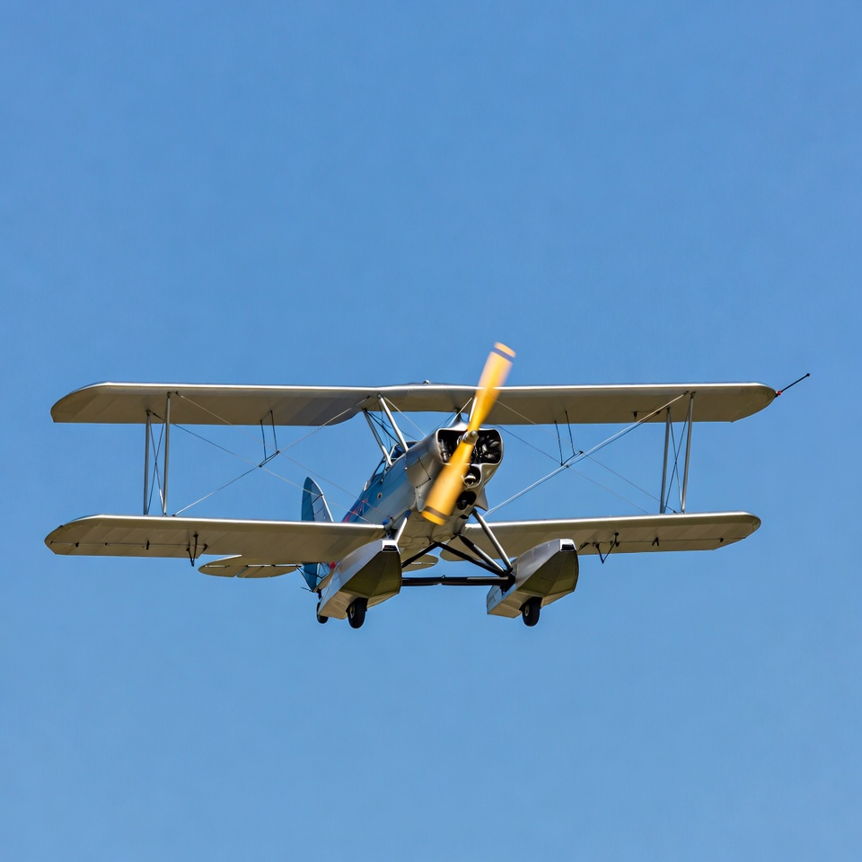 A vintage blue biplane seaplane with yellow propeller flies against a clear blue sky. It features two wings with struts, floats for water landings, and a blurred spinning propeller. The aircraft is captured in mid-flight from below.