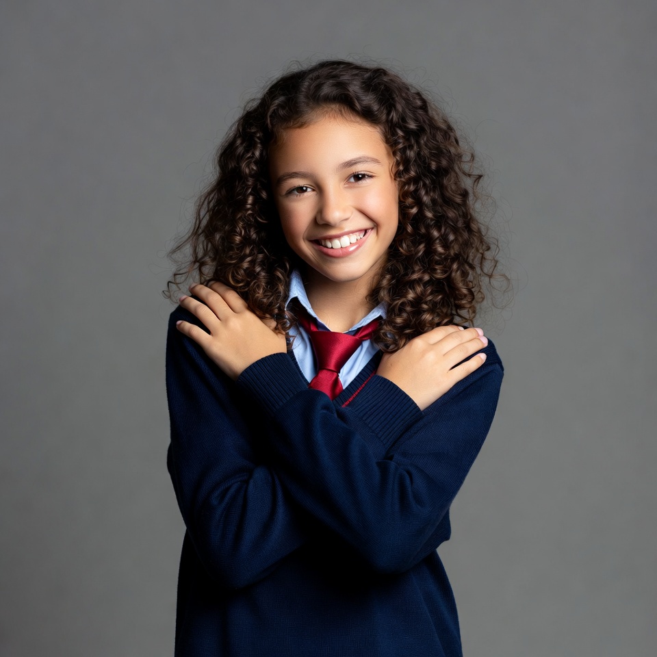 A young girl with curly brown hair smiles happily at the camera. She wears a navy blue sweater, white collared shirt, and red tie in a school uniform style. Her arms are crossed over her chest against a plain gray background.