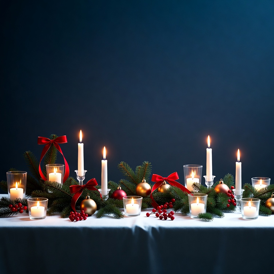 A festive Christmas table centerpiece features multiple lit white candles in glass holders arranged on a white tablecloth. Red ribbons, gold and red Christmas baubles, fir branches, and red berries decorate the display. The dark blue background highlights the warm glow of the flickering candle flames.