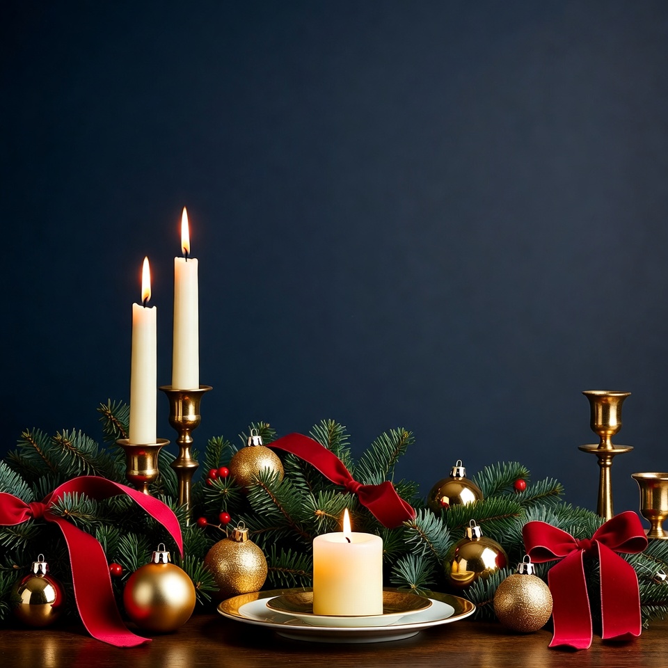 Festive Christmas arrangement on a wooden table features lit white taper candles in gold candlesticks. Evergreen branches adorned with red ribbons and gold ornaments surround a central white pillar candle on a plate. The setup is displayed against a dark blue background.