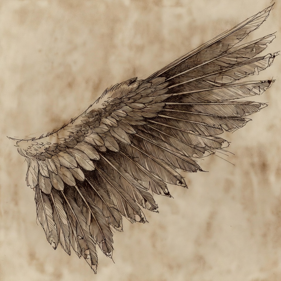 artistic drawing, beige texture, bird wing, detailed feathers, drawing wing, fantasy art, feather details, ink sketch, isolated background, large wing, line art, parchment background, pencil drawing, shaded feathers, single wing, textured paper, vintage paper, wildlife art, wing illustration, angel wing