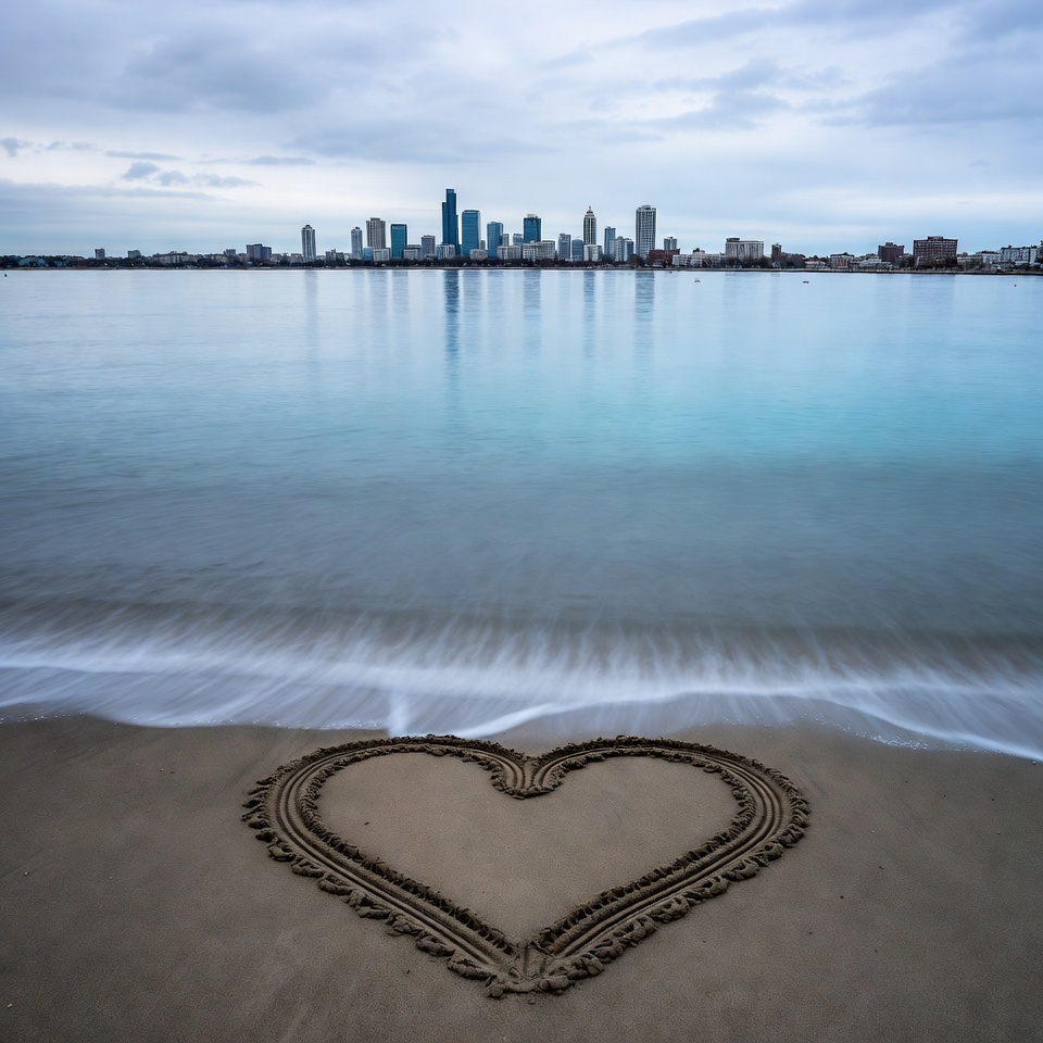 A large heart is intricately drawn in the sand at the edge of a calm lake with gentle waves lapping over it. In the background, a modern city skyline with tall blue-tinted skyscrapers reflects perfectly on the water under a cloudy sky. The scene captures a serene waterfront landscape with no people visible.