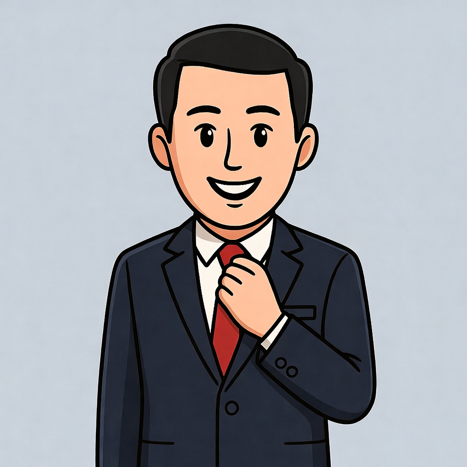 A cartoon illustration of a smiling man with short black hair stands on a light gray background. He wears a dark blue suit, white shirt, and red tie, with his right hand adjusting the tie. His expression is cheerful with large eyes and a wide grin.