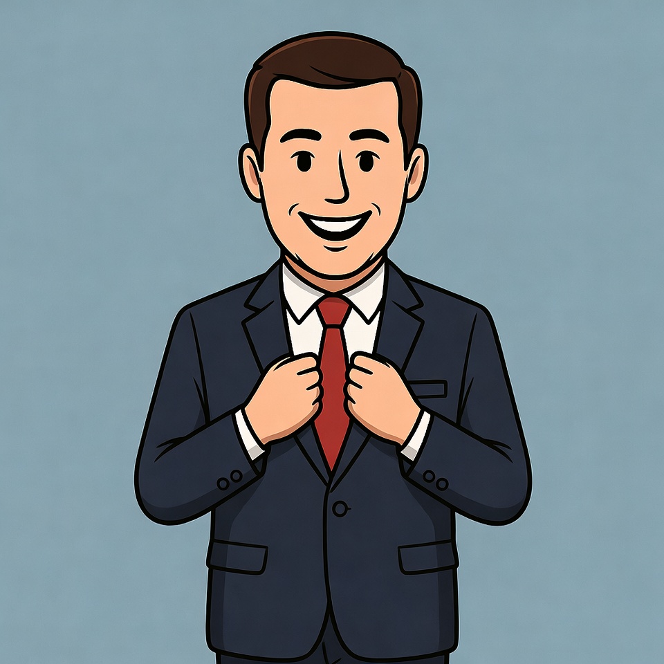 A cartoon illustration of a smiling man with short brown hair stands on a light blue background. He wears a dark blue suit, white shirt, and red tie, with his hands adjusting the tie at his chest. His expression is cheerful with large eyes and a wide grin.