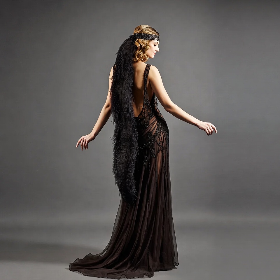 A woman with blonde bobbed hair and a feathered headpiece stands in profile wearing a sheer black lace and feather evening gown. The backless dress features long black feathers draping down the side and a flowing train. She poses gracefully with arms extended against a gray background.
