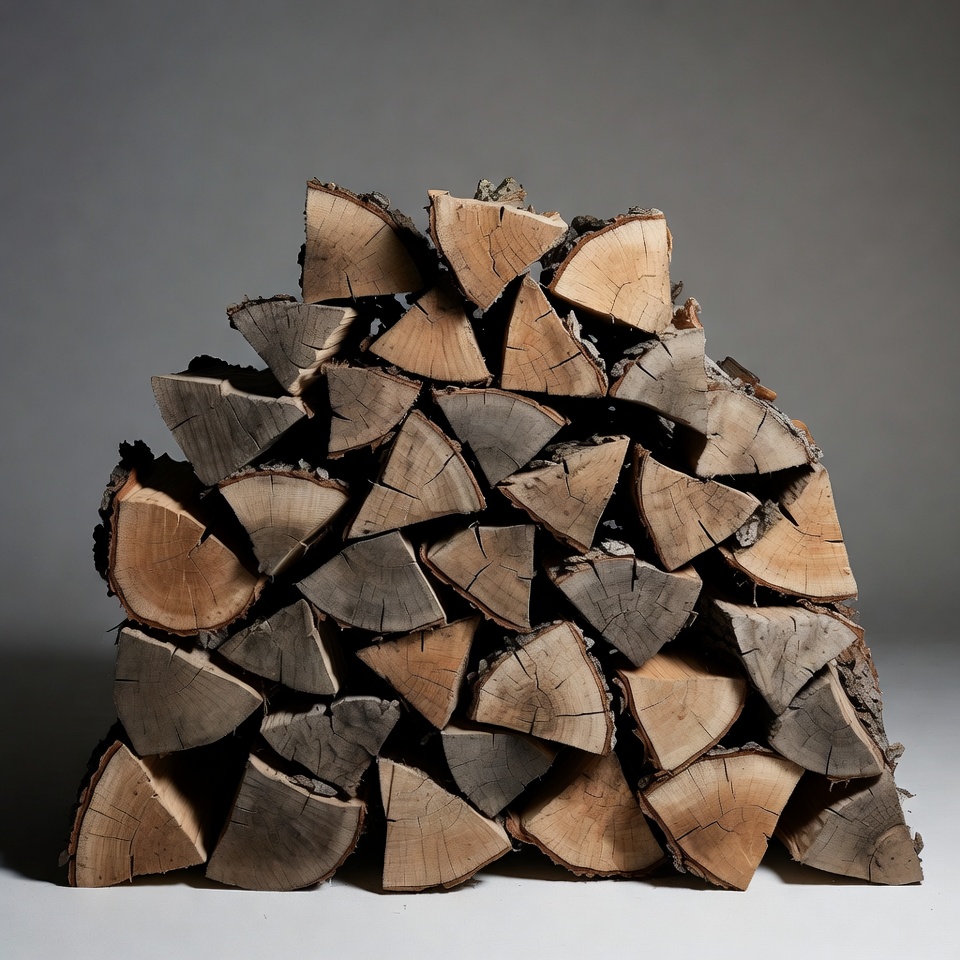 A tall stack of chopped firewood logs is arranged in a pyramid shape against a plain gray background. The logs show varied shades of brown and gray with visible bark and cut ends. The wood appears dry and ready for use.