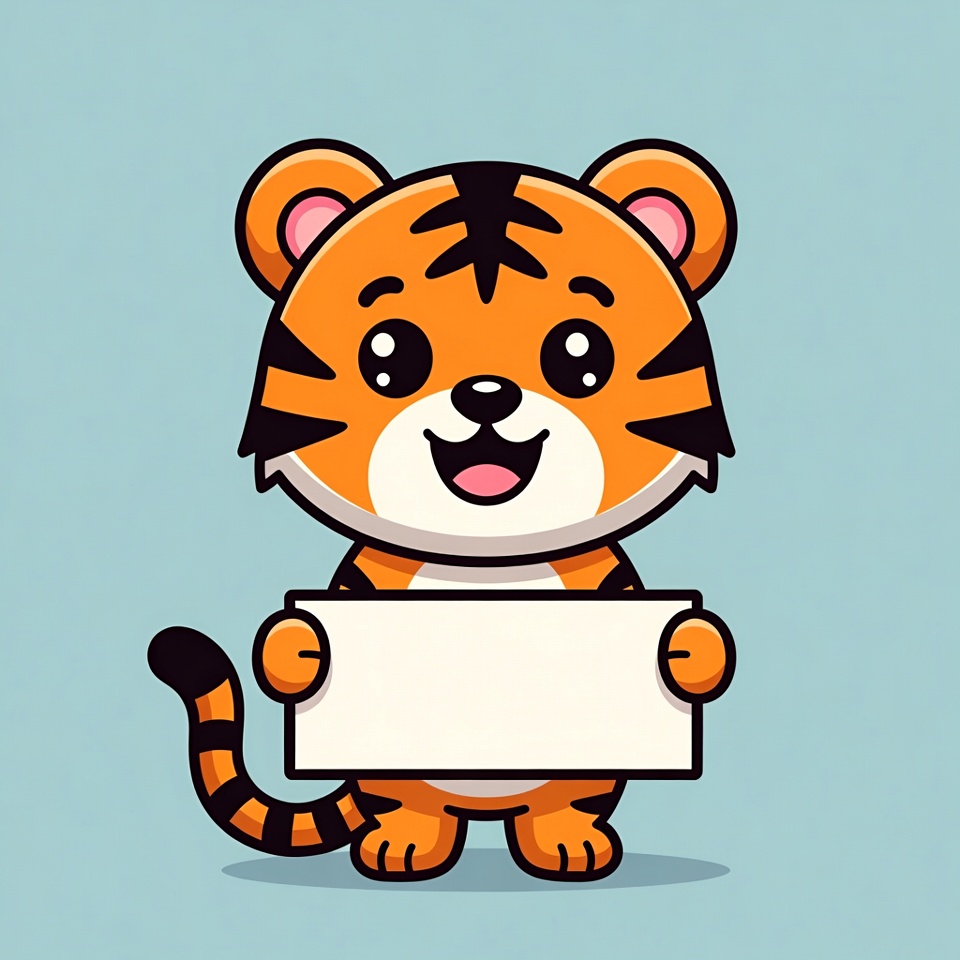 animal, baby tiger, big eyes, black stripes, blank sign, cartoon tiger, clipart, cute tiger, happy smile, holding sign, illustration, isolated background, kawaii tiger, orange tiger, tiger cub, vector art, white sign, tiger