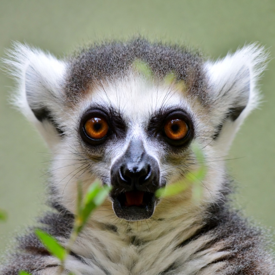 animal, black nose, close-up, cute lemur, fluffy fur, gray fur, green leaves, isolated background, large eyes, madagascar animal, mouth open, orange eyes, primate, ring-tailed lemur, white ears, white face, wildlife, zoo animal, lemur
