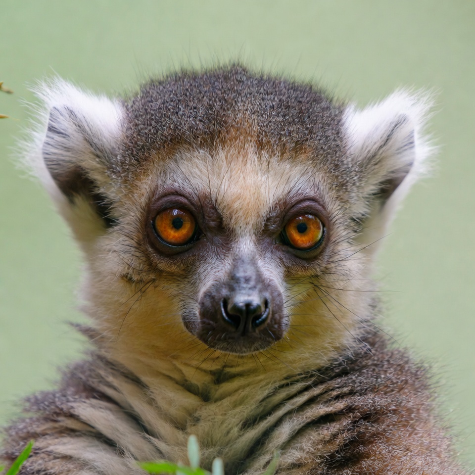 animal, black nose, close-up, fur, green background, isolated background, madagascar animal, mammal, orange eyes, portrait, primate, ring-tailed lemur, white ears, wildlife, lemur
