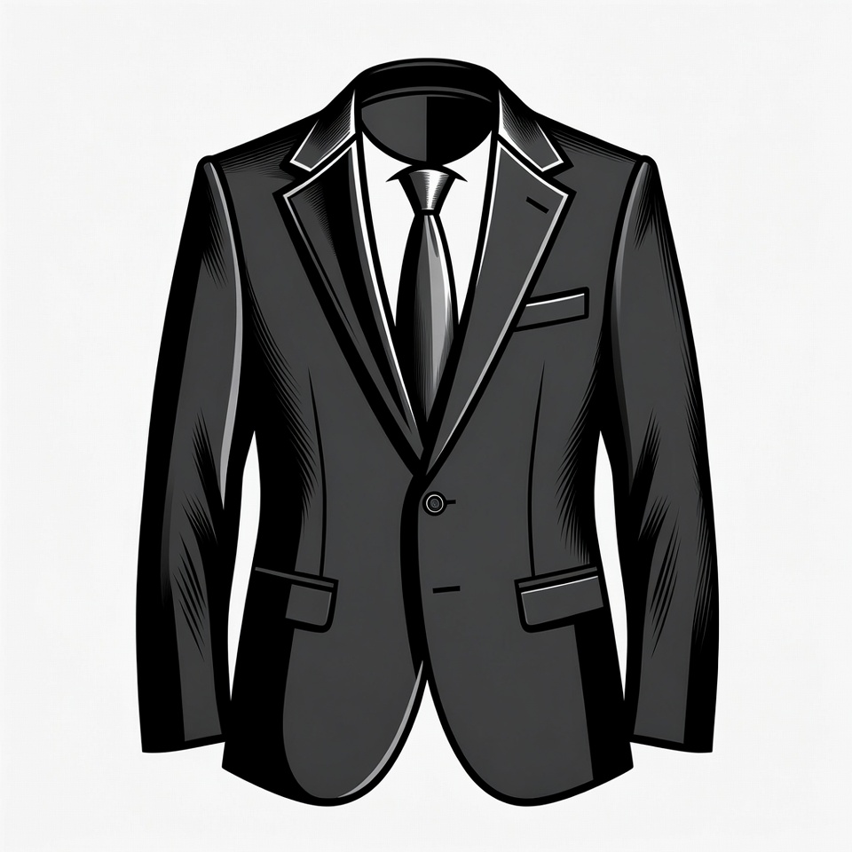 business attire, clipart, clothing, elegant suit, fashion, formal suit, formal wear, illustration, isolated background, jacket, lapel, line art, mens suit, menswear, suit, tie, tuxedo jacket, vector art, white shirt, black suit