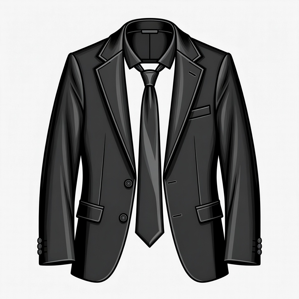 business attire, clipart, dress shirt, fashion, formal clothing, formal wear, illustration, isolated background, jacket, mens suit, necktie, pants, suit, tie, tuxedo, vector, white shirt, black suit