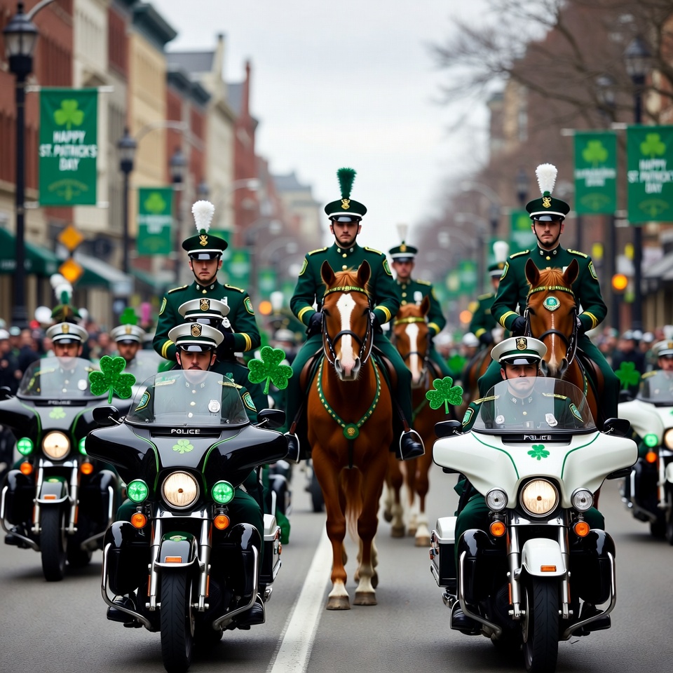 Mounted police officers in green uniforms and hats ride horses down a city street lined with green shamrock banners and 'Happy St. Patrick's Day' signs. Police motorcycles with green accents lead and follow the procession. Brick buildings and street lamps frame the festive parade under overcast skies.
