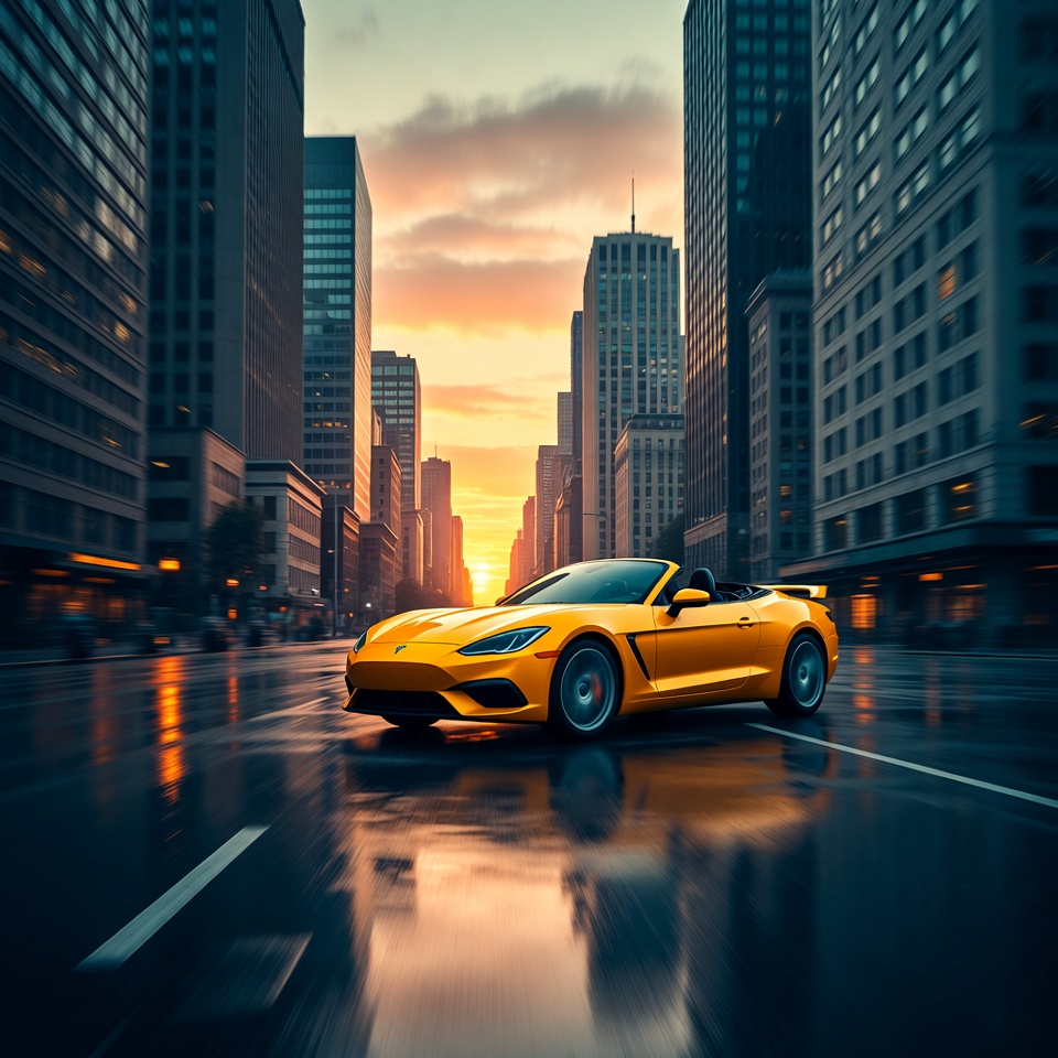 Yellow Convertible Speeding in City at Sunset