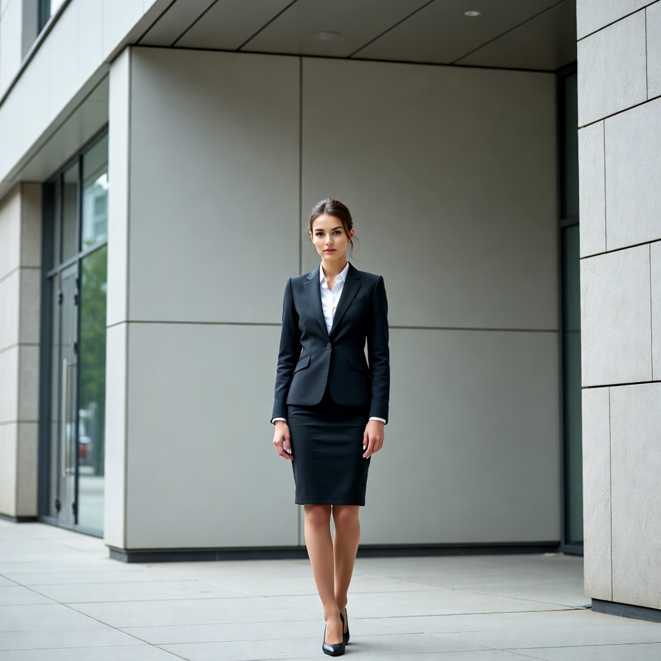 A young woman with dark hair stands confidently in front of a modern glass building. She wears a tailored black blazer, white blouse, and knee-length black pencil skirt with black high heels. The urban architecture features gray panels and large windows behind her.