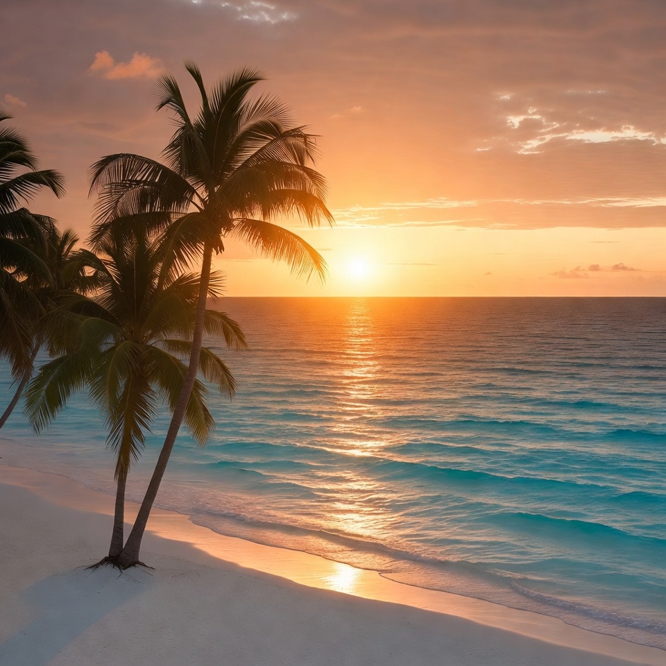 Tall palm trees line a pristine white sand beach at sunset. The sun dips toward the turquoise ocean, casting golden reflections on the calm waves. Vibrant orange and pink clouds fill the sky above the serene shoreline.
