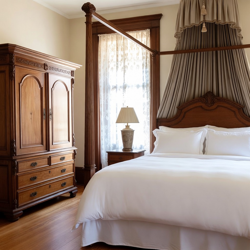 antique bed, armoire, bedroom interior, canopy bed, carved details, classic furniture, elegant decor, four poster bed, gray drapes, hardwood floor, lace curtains, lamp, luxury bedroom, nightstand, ornate wood, sunlit room, traditional bedroom, white bedding, wooden furniture, Victorian bedroom