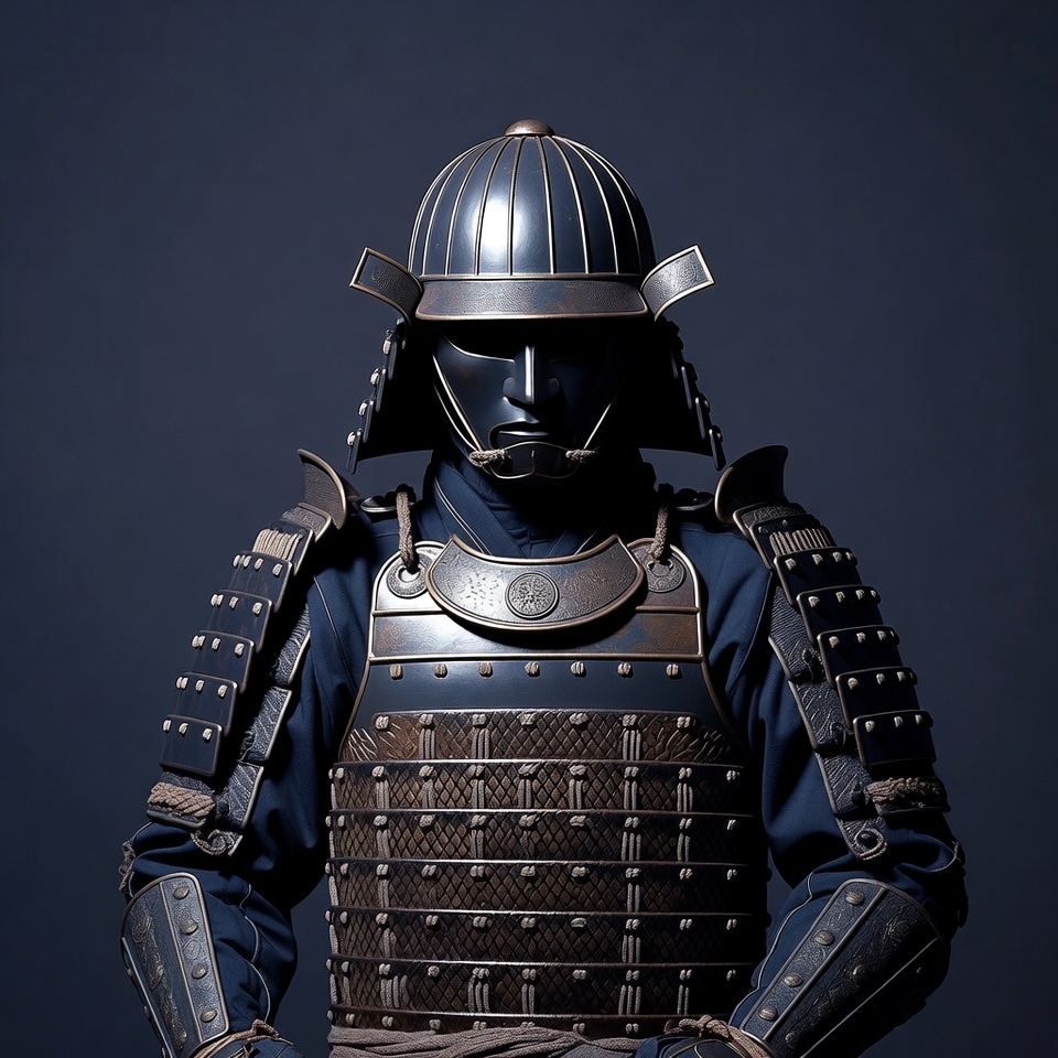 A samurai warrior stands in full traditional Japanese armor on a dark isolated background. He wears a kabuto helmet with decorative ridges and a menacing menpo face mask. The armor features layered metal plates, intricate patterns, and protective gauntlets.