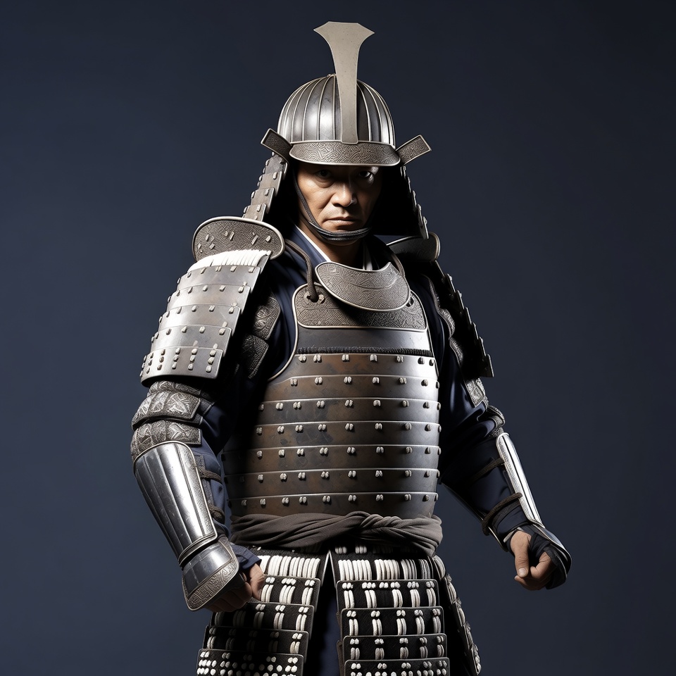 A male Asian samurai stands in a poised stance wearing detailed traditional Japanese armor. He has a stern expression and wears a kabuto helmet with decorative crest. The armor features layered metal plates in silver and dark tones against a dark blue background.