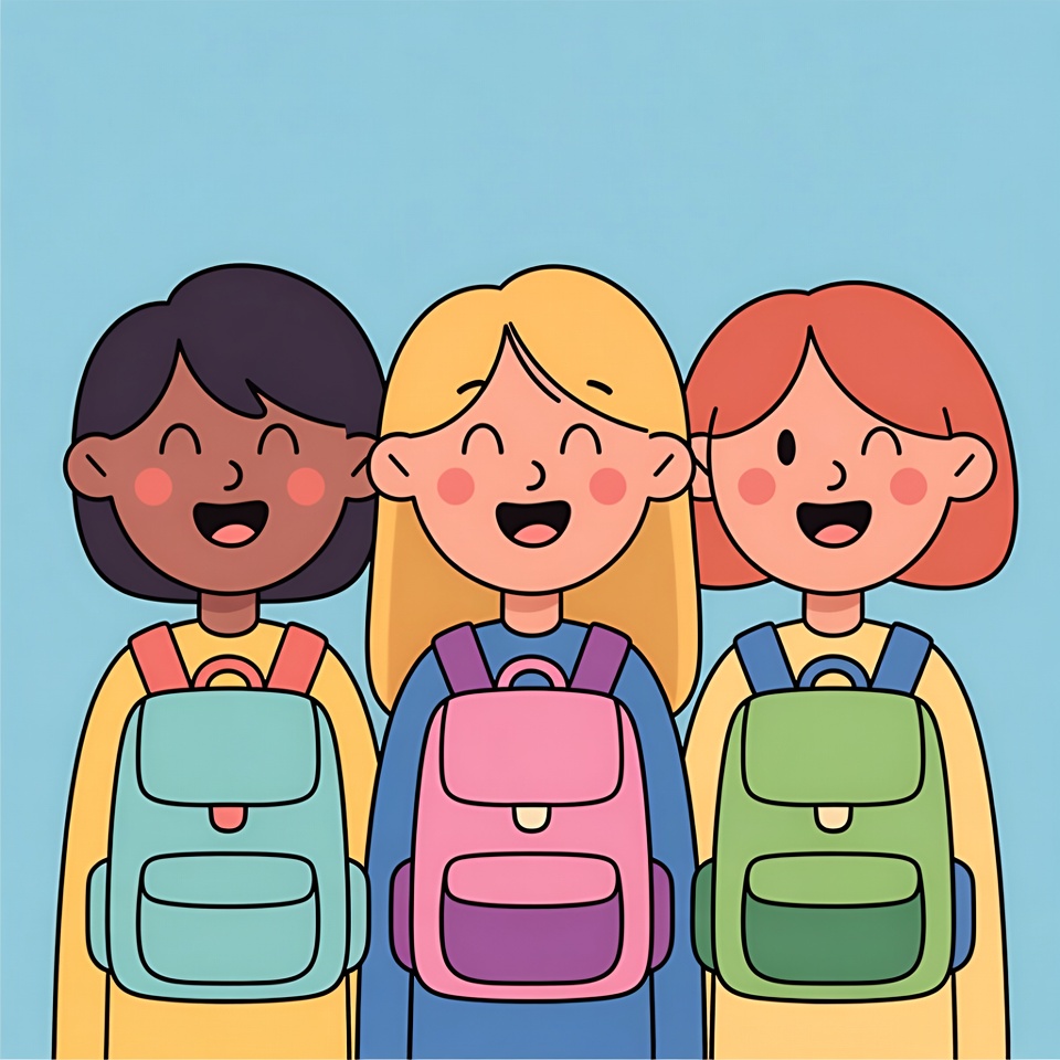 Three cartoon girls with different hair colors stand smiling together on a blue background. The girl on the left has dark skin and brown hair with a teal backpack, the middle girl has blonde hair and a pink backpack, and the right girl has red hair and a green backpack. All wear yellow tops and express joy with rosy cheeks.