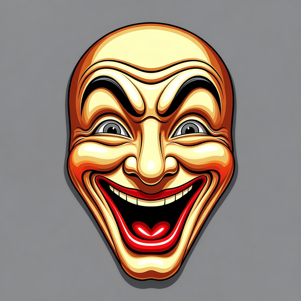 black eyebrows, cartoon mask, clipart, comedy mask, exaggerated expression, funny face, golden skin, grinning mouth, illustration, isolated background, laughing mask, red tongue, theater mask, vector art, wide eyes, jester mask