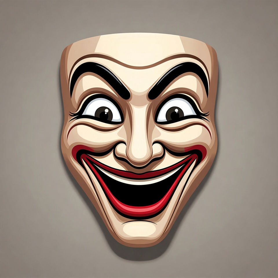A vibrant cartoon illustration of a jester mask with wide eyes and a big red smiling mouth. The mask features thick black eyebrows, exaggerated facial expressions, and a pale beige face on a plain gray background. It is designed in a playful, theatrical style with bold outlines.