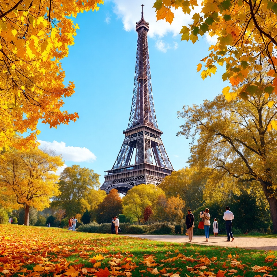 The Eiffel Tower stands tall against a clear blue sky, framed by vibrant yellow and orange autumn trees with falling leaves. A group of people, including men and women, walks along a path in the foreground on a grassy park area covered in leaves. The scene captures the iconic landmark surrounded by fall foliage.