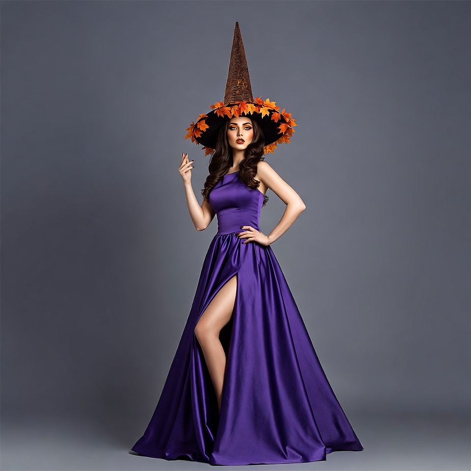 A woman with long wavy dark hair wears a tall black pointed witch hat decorated with orange maple leaves. She poses confidently in a form-fitting purple satin gown with a high slit revealing her leg, standing against a plain gray background. She holds her fingers near her lips in a playful gesture.