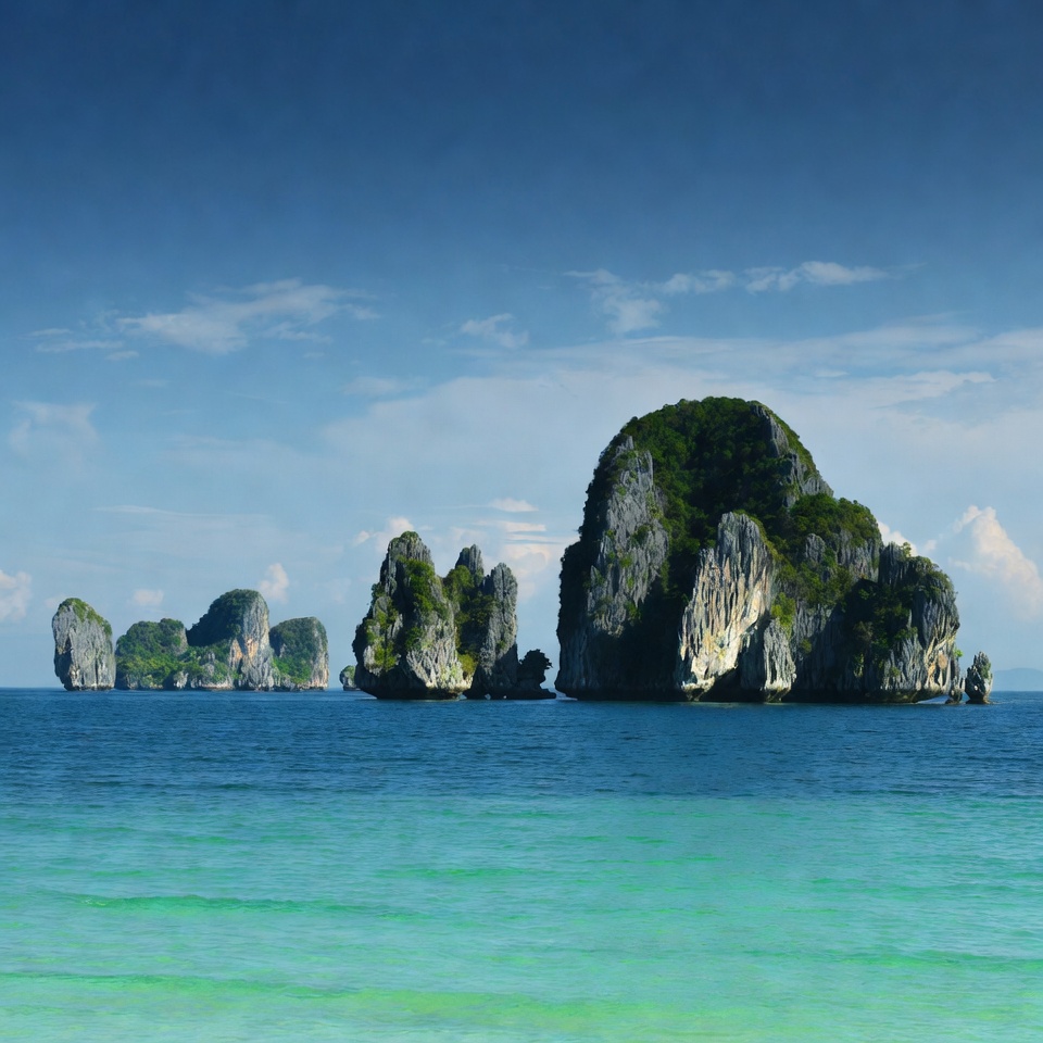 Andaman Sea, Phang Nga Bay, Thailand scenery, blue sky, clouds, coastal scenery, green vegetation, island landscape, karst islands, limestone cliffs, nature, ocean, rock formations, rugged rocks, sea, travel, tropical bay, turquoise water, vacation, limestone karsts